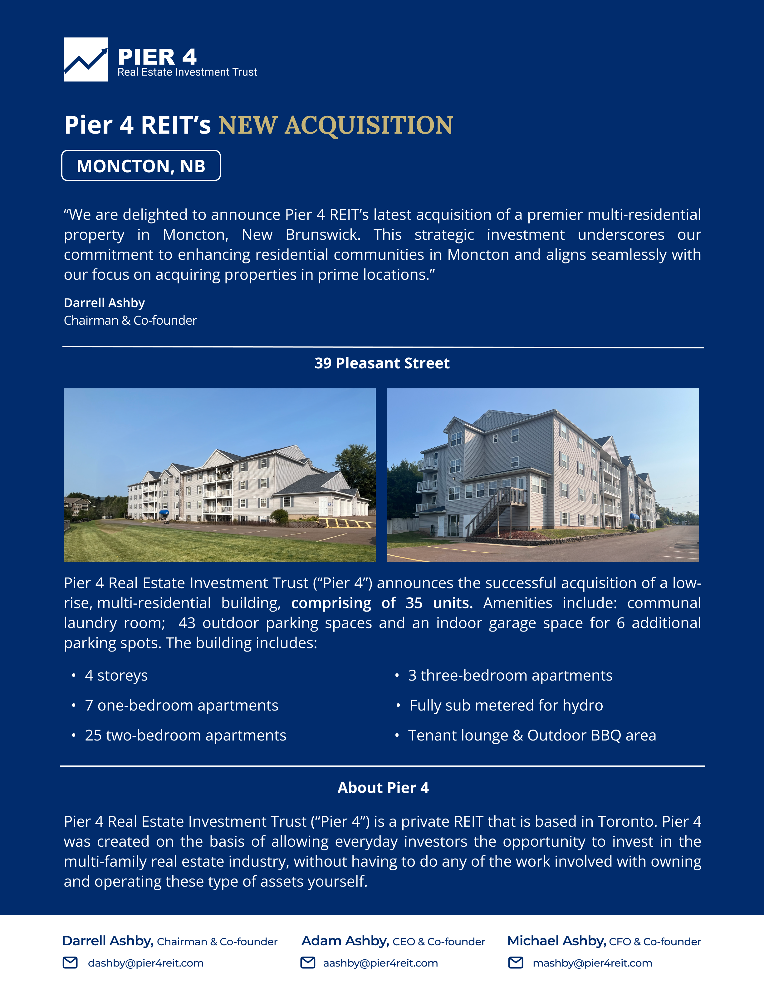 Pier 4 Real Estate Investment Trust completes acquisition of multi-residential property in Moncton, New Brunswick.